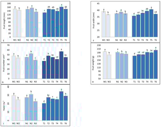 Shoot height (A), SPAD index (B), stem diameter (C), root length (D), fruit length (E), fruit width (F), number of fruit unit−1 (G), fruit weight (H), and yield (ton ha−1) (I) of cucumber-treated plants treated with 50, 70, and 100% nitrogen deficit (N1, N2, and N3) and 50 and 100% full drip irrigation (W1 and W2). The interaction study is represented by T1 (Full irrigation, 100% nitrogen), T2 (Full irrigation, 70% nitrogen), T3 (Full irrigation, 50% nitrogen), T4 (Deficit irrigation, 100% nitrogen), T5 (Deficit irrigation, 70% nitrogen), and T6 (Deficit irrigation, 50% nitrogen) respectively with three replicates per treatment. The different letters indicate significance according to the Tukey’s test (p < 0.05).
