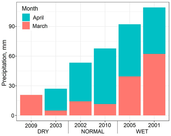 Sum of precipitation in the months of March and April in the studied years with the indication of the rainfall categories (dry, normal, wet).