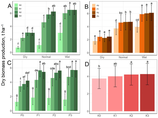 Effect of rainfall–N (A), rainfall–P (B) and N–P (C) interactions and K treatment (D) on dry biomass production mean values. The columns represent the means and the error bars the standard deviation. The letters indicate significant differences between the means (Tukey’s HSD, p < 0.05).
