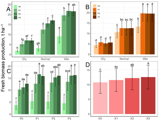 Effect of the rainfall–N (A), rainfall–P (B) and N–P (C) interactions and K treatment (D) on fresh biomass production mean values. The columns represent the means and the error bars the standard deviation. The letters indicate significant differences between the means (Tukey’s HSD, p < 0.05).