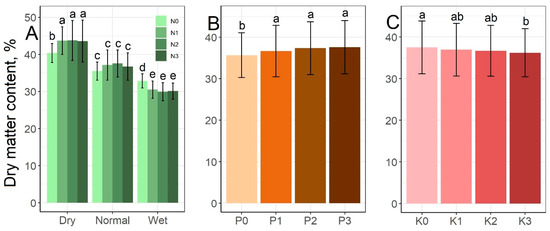 Effect of the rainfall–N interaction (A), P (B) and K treatment (C) on dry matter content mean values. The columns represent the means and the error bars the standard deviation. The letters indicate significant differences between the means (Tukey’s HSD, p < 0.05).
