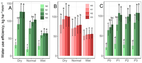 Effect of the rainfall–N (A), rainfall–K (B) and N–P (C) interactions on water use efficiency mean values. The columns represent the means and the error bars the standard deviation. The letters indicate significant differences between the means (Tukey’s HSD, p < 0.05).