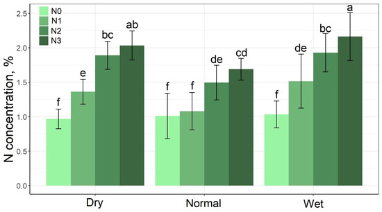 Effect of the rainfall–N interaction on N content mean values of grass aboveground biomass. The columns represent the means and the error bars the standard deviation. The letters indicate significant differences between the means (Tukey’s HSD, p < 0.05).