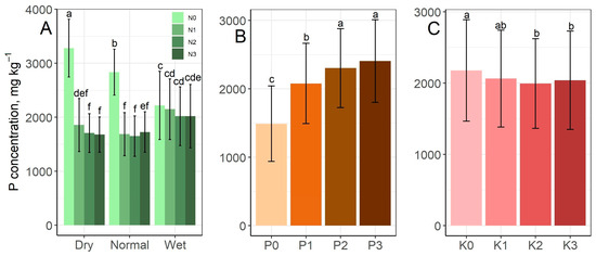 Effect of the rainfall–N (A) and P–N interactions (B) and K treatment (C) on the P content mean values of grass aboveground biomass. The columns represent the means and the error bars the standard deviation. The letters indicate significant differences between the means (Tukey’s HSD, p < 0.05).