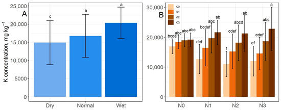 Effect of rainfall (A) and the K–N interaction (B) on K content mean values of grass aboveground biomass. The columns represent the means and the error bars the standard deviation. The letters indicate significant differences between the means (Tukey’s HSD, p < 0.05).