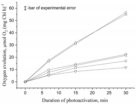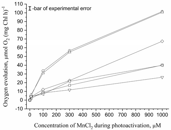 To standardize the measurement of oxygen-evolving activity, photoactivated apo-WOC-PSII preparations were diluted ten times with the medium containing 50 mM Mes-NaOH (pH 6.5), 35 mM NaCl, 0.33 M sucrose and 20 mM CaCl2 to a final concentration of 20 μg Chl/mL (in this case, the concentration of the additions used during photoactivation of the samples decreased 10 times); then, the electron acceptors (1 mM ferricyanide and 100 μM DCBQ) were added. In preliminary experiments, it was shown that the addition of any osmolytes in the concentration of 0.1 M to the measurement medium did not affect the oxygen-evolving activity of the photoactivated samples.