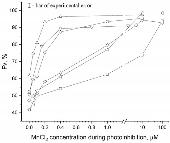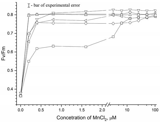 Dependence of the reactivation of photoinduced changes in the chlorophyll a fluorescence yield (Fv) on concentration of exogenous MnCl2. Fv reactivation was performed in the medium containing 50 mM Mes (pH 6.5), 35 mM NaCl in the absence of osmolyte (☐) and in the presence of 1 M sucrose (◯), 1 M trehalose (△), 1 M D-glucose (▽), 1 M betaine (◇) and 1 M Ect-OH (◁) at chlorophyll concentration of 10 μg/mL. All experiments were repeated three times. Data are presented as mean values ± standard deviation.