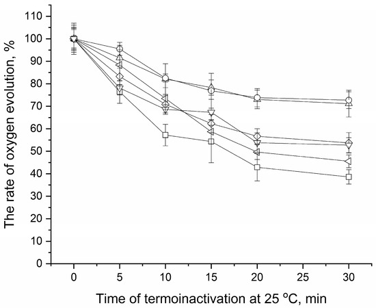 The stability of CaCl2-PSII preparations during their incubation at 25 °C was determined based on the loss of oxygen-evolving activity of the samples. The incubation of CaCl2-PSII preparations was performed in the dark at 110 μg Chl/mL in a medium containing 50 mM Mes (pH 6.5), 35 mM NaCl and 20 mM Ca2+ (medium A) in the absence or in the presence of 1 M osmolytes. After that, the preparations were diluted 11 times with medium A containing 0.01 M osmolytes, and then, the electron acceptors (1 mM ferricyanide and 100 μM DCBQ) were added. As a result of this dilution, the concentration of osmolytes during the measurement of oxygen-evolving activity was equal to 0.1 M. So, in order for the measurement conditions to be the same, the samples incubated in the absence of osmolyte were diluted with media containing 0.11 M osmolytes.