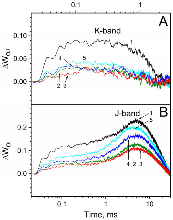 Difference kinetics ∆WOJ and ∆WOI showing K-band (A) and J-band (B) formation in ChlF transients double-normalized between F0 and FJ phases, WOJ = (Ft − F0)/(FJ − F0), and between F0 and FI phases, WOI = (Ft − F0)/(FI − F0), induced by heat treatment of PSII membrane fragments. Heat treatment (HT, 30 °C, 40 min) was performed in darkness in the absence of osmolytes (1) and in the presence of 1 M sucrose (2), 1 M trehalose (3), 1 M betaine (4) and 1 M Ect-OH (5) in a medium containing 50 mM Mes (pH 6.5) and 35 mM NaCl at 10 μg Chl/mL. The presented kinetics are the differences ∆WOJ = [WOJ after HT − WOJ before HT] and ∆WOI = [WOI after HT − WOI before HT] of the average for 4 “before HT” and 5 “after HT” independent curves. In all experiments, Fv was induced by a single 880 ms saturating flash (λ = 625 nm, 2360 µmol photons m−2 s−1). Measurements were performed in a medium containing 50 mM Mes (pH 6.5) and 35 mM NaCl at 10 μg Chl/mL at room temperature, 25 °C.