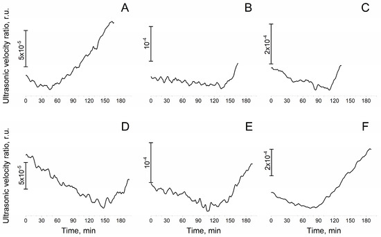 Changes in the relative velocity of ultrasound in the suspension containing photosystem II preparations with the native water-oxidizing complex during their incubation at 25 °C. Measurements were performed in the medium containing 50 mM Mes (pH 6.5) and 35 mM NaCl in the absence (A) and in the presence of 1 M sucrose (B), 1 M trehalose (C), 1 M D-glucose (D), 1 M betaine (E) and 1 M Ect-OH (F) at 200 μg Chl/mL and were repeated at least three times.