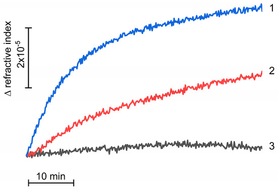 Changes in the refractive index in the suspension containing photosystem II preparations with the native water-oxidizing complex in the absence (1) and in the presence of 1 M trehalose (2) during their incubation at 25 °C. Curve 3 reflects changes in the refractive index in 1 M trehalose solution without PSII preparations. Measurements were performed in the medium containing 50 mM Mes (pH 6.5) and 35 mM NaCl at 200 μg Chl/mL and were repeated at least three times.