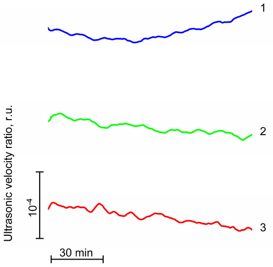 Changes in the relative velocity of ultrasound in the suspension containing photosystem II preparations with the native water-oxidizing complex (1), NaCl-PSII preparations (2) and CaCl2-PSII preparations (3) during their incubation at 25 °C. Measurements were performed in the medium containing 50 mM Mes (pH 6.5) and 35 mM NaCl at 200 μg Chl/mL and were repeated at least three times.