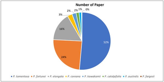 The most treated species was P. tomentosa, with 336 publications in WoS, followed by P. fortunei with 160 publications, and P. elongata with 104. The other species, coreana, kawakamii, catalpifolia, australis, and fargesii were less examined and had far fewer publications on WoS, with 18, 15, 11.9, and 2 publications, respectively (Figure 3).