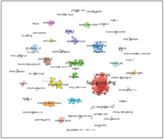 A total of 2379 authors were involved in publishing 820 publications; of them, 201 met the threshold of 3 publications. The VOS analysis in the field of paulownia brought out 54 clusters with different colors (Figure 4). The largest set of connected items consists of 22 items. The colors of the ten largest clusters were red, green, yellow, blue, orange, light blue, violet, pink, and brown. The size of the circles relates to the total number of records (a larger number of publications, a larger circle). Authors who have studied in a similar field or in a same research group and have closely collaborated with each other are grouped in a single cluster.