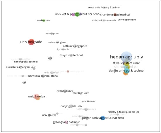 Among the affiliations involved in the publications of 820 papers on paulownia, 134 met the threshold of at least three publications. There were 47 clusters gathered, the largest with nine items and the smallest with only one item: the largest set of connected items consisted of 38 affiliations.