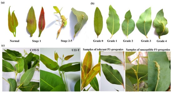After gall wasp infestation, developmental stages of gall formation by L. invasa were classified into 5 stages Stage 1, the first symptoms showed the oviposition scars at the oviposition site (oviposition signs) on the young vascular tissues. In this stage, the phenotype change was classified into grades 1 and 2 of the damage severity level. In stages 2–4, the gall was enlarged. The phenotype change was classified into grades 3 and 4 of the damage severity level. Finally, the adult emerged from the gall in stage 5 (Figure 1a). Based on the number of oviposition signs and galls visible on the whole tree [,], the phenotype changes were used to assess the damage severity level of two parents and F1-progenies that was divided into five-grade criteria (Figure 1b) as follows;