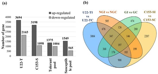 The differential gene expression in two parents and two pools under infestation and un-infestation conditions was analyzed with the edgeR. Genes that had an adjusted q-values threshold of 0.05 were selected as differentially expressed. U22-T revealed 5859 significant DEGs, of which 3694 were up-regulated, and 2165 were down-regulated. C153-S showed 4296 DEGs, of which 3198 were up-regulated, and 1098 were down-regulated. The tolerant pool revealed 2379 DEGs, of which 1375 were up-regulated, and 1004 were down-regulated. The susceptible pool showed 2114 DEGs, of which 1549 were up-regulated, and 565 were down-regulated genes (Figure 2a). The overlap area of U22-TI vs. U22-TC and NGI vs. NGC included 676 unique genes specific for the tolerant group, and the overlap area of C153-SI vs. C153-SC and GI vs. GC included 280 unique genes specific for the susceptible group (Figure 2b).