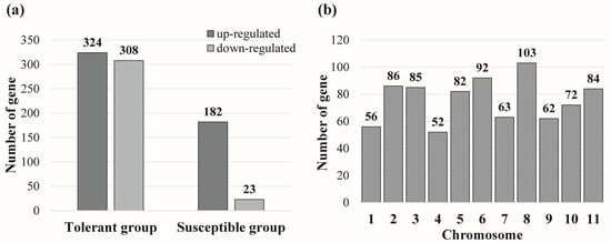 Differential gene expression analysis of the tolerant and the susceptible groups under infested and un-infested conditions at three days after gall wasp infestation: (a) The number of up-regulated and down-regulated genes specific for the tolerant group, including U22-T and the tolerant pool, and the susceptible group including C153-S and the susceptible pool. The up-regulated genes are presented in blue, and the down-regulated genes are shown in red; (b) The number of the DEGs specific for the tolerant and susceptible groups on the chromosomes of the Eucalyptus genome, n = 11.