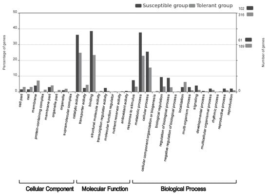 Gene Ontology (GO) analysis of the DEGs specific for the tolerant and susceptible groups under infested and un-infested conditions at three days after infestation. The GO term classified a total of 632 DEGs specific for the tolerant group and 205 DEGs specific for the susceptible group into three categories; CC, MF, and BP. The left y-axis indicates the percentage of ex-pressed genes in that category. The right y-axis shows the number of expressed genes in a category.