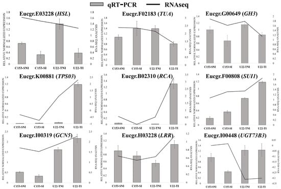 Validation of RNA-Seq results using qRT-PCR. Nine genes were validated in the susceptible (C153-S) and tolerant (U22-T) parents under infested and un-infested conditions at three days after infestation. The x-axis indicates C153-SC, C153-SI, U22-TC, and U22-TI, respectively. Histograms indicate the relative normalized expression value in three replicates obtained by qRT-PCR; the solid lines in all plots indicate the log10 FPKM values obtained by RNA-seq.