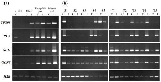 To validate the expression patterns of the genes of interest from qRT-PCR results in two pools (the tolerant and susceptible pools) and the selected individual plants under infested and un-infested conditions, the RT-PCR method was utilized and the H2B gene was used as the internal control. The four genes of interest, including TPS03, SUI1, RCA, and GCN5, were found to be up-regulated in the tolerant parent (U22-T) and the tolerant pool, while they were down-regulated or did not show expression in the susceptible parent (C153-S). However, the susceptible pool did not show a similar pattern of expression with the susceptible parent (Figure 7a).