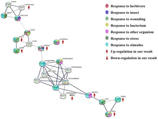 The functional association. Genes in the tolerant group that associated with response to biotic and abiotic stress were use as query to search orthologous proteins in Arabidopsis thaliana database: The STRING interaction network represents the known and predicted protein interactions. The red arrows showed up- or down-regulated genes that found in our analysis. The node color represents functional enrichments. Line thickness indicates the confidence of the association.