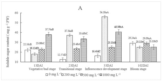 At bloom stage, the sugar content was almost similar in the control plants and in plants treated with the three TDZ concentrations (Figure 2A).