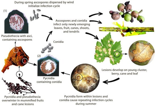 Disease cycle of black rot is shown with symptoms schematically in Figure 1. In spring, pycnidia produce conidia and pseudothecia produce ascospores that, under favourable conditions, infect all young green tissues (leaves, shoots and bunches) of a susceptible vine [9,33,34]. The vast majority of ascospore discharge have been recorded by the end of the bloom period, though drought during the prebloom and bloom period can delay ascospore depletion until rains resume. Moreover, ascospores from mummies left on the ground can be discharged not just in the beginning of the growing season but from bud break through mid-summer and they continue to be produced into late summer from mummies that are retained in the canopy, thus providing continuous primary infection. Since the ascospores are actively ejected and airborne, they allow black rot to spread over long distances. They can infect susceptible hosts from 100 m or even a longer distance from the nearest inoculum source (e.g., wild grapevines); however, their density is diluted with distance [9,14,35].