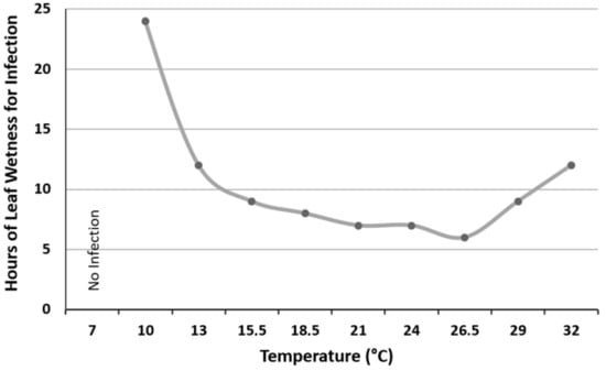 Duration of continuous leaf wetness necessary for infection by the black rot fungus at different temperatures [43].