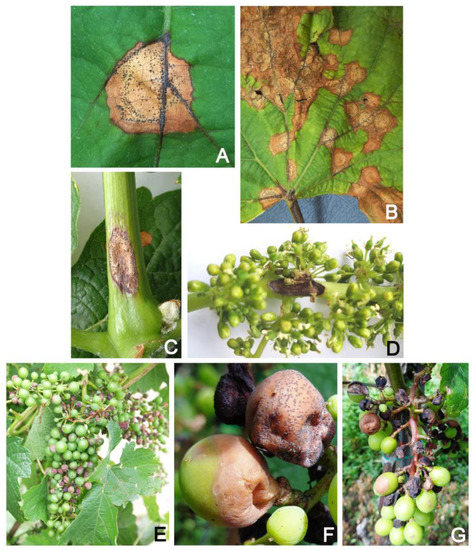 (A) Leaf spot with abundant black pycnidia. (B) Leaf spots fused together. (C) A lesion on torn skin tissue of a shoot. (D) Rachis infection. (E) Partial cluster infection. (F) Berries turning brown and mass of pycnidia become apparent on berries. (G) Alternating healthy and discoloured diseased berries.
