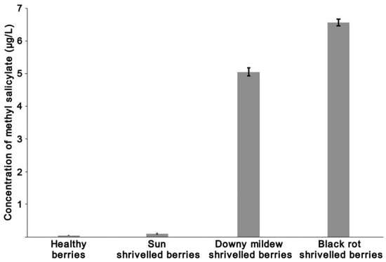 - Poitou, X.; Redon, P.; Pons, A.; Bruez, E.; Delière, L.; Marchal, A.; Cholet, C.; Geny-Denis, L.; Darriet, P. Methyl Salicylate, a Grape and Wine Chemical Marker and Sensory Contributor in Wines Elaborated from Grapes Affected or Not by Cryptogamic Diseases. Food Chem. 2021, 360, 130120. [Google Scholar] [CrossRef]