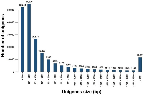 The unigenes of the transcriptome were annotated, and sequence similarity analysis was conducted using six databases: NT, NR, Pfam, GO, UniProt, and EggNOG. The greatest number of annotations were retrieved from the NR database, i.e., 38,320 (18.62%), and the least were retrieved from the NT database, i.e., 15,237 (7.4%) (Table 3). Furthermore, 35,511 (17.25%) unigenes were annotated using EggNOG, and 27,659 (13.44%) unigenes were annotated using Pfam. Additionally, 26,274 (12.76%) unigenes were annotated using the UniProt databases. The size distribution of the unigenes is shown in Figure 1.