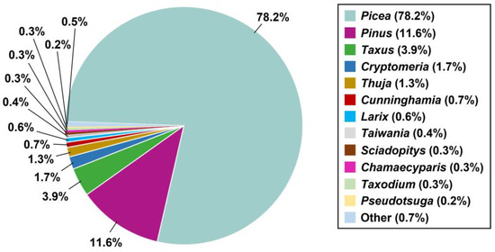 The top-scoring BLASTX hits against the NR protein database showed that 78.2% of the unigenes were present in the genus Picea, 11.6% were present in the genus Pinus, and 3.9% were present in the genus Taxus (Figure 2). Moreover, in the cypress family (Cupressaceae), 1.7% of the unigenes were present in the genus Cryptomeria, and 1.3% and 0.7% of the unigenes were present in the genera Thuja and Cunninghamia, respectively. The most abundant transcript, with 5961 reads, was annotated as a hypothetical protein of Citrus unshiu. The 20 most abundant transcripts are listed in Table 4. Two unigenes matched the auxin transport protein in Amborella trichopoda and Quercus suber.
