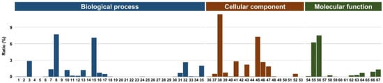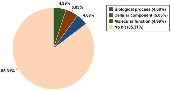 For functional classification of T. koraiensis unigenes, the GO database was employed along with BLASTX of DIAMOND with an E-value cut-off of 1.0 × 10−5. The GO terms belonging to biological processes, cellular components, and molecular functions were listed. Subsequently, 30,241 (14.69%) of the total unigenes were assigned GO terms, with 4.68% assignments from biological processes, 5.03% from cellular components, and 4.99% from molecular functions (Figure 3).