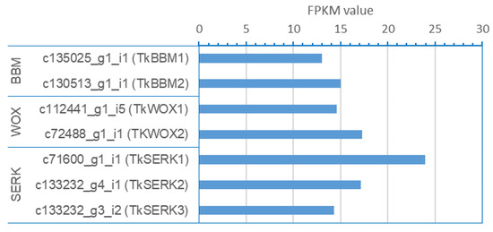 FPKM values of selected contigs of BBM, SERK, and WOX in annotated transcriptome sequences of T. koraiensis embryogenic callus.