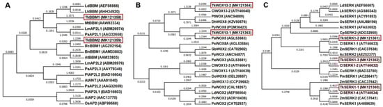 Phylogenetic tree of the putative TkBBM (TkBBM1 and TkBBM2), TkWOX (TkWOX1 and TkWOX2), and TkSERK (TkSERK1, TkSERK2, and TkSERK3) proteins based on the NCBI database and representatives characterizing each protein from broad plant lineages. (A) TkBBM1 and TkBBM2; (B) TkWOX1 and TkWOX2; (C) TkSERK1, TkSERK2, and TkSERK3.