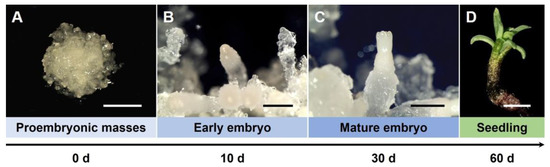 Characteristic stages of somatic development of T. koraiensis embryos and seedling. (A) Proembryonic masses (PEMs) on maturation medium. Scale bar: 5 mm. (B) Early embryo on maturation medium after 10 days. Scale bar: 1 mm. (C) Fully mature cotyledonary embryo on maturation medium after 30 days. Scale bar: 2 mm. (D) Somatic seedling with the first true needles emerging and a taproot on germination medium after 60 days. Scale bar: 1 mm.