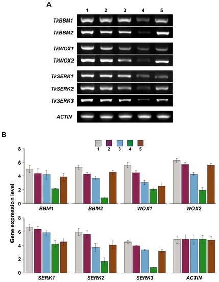 For RT-PCR, embryogenic calluses at three different developmental stages and somatic seedling leaves and roots were collected (Figure 7). The expression of TkBBM, TkWOX, and TkSERK during SE was analyzed (Figure 8). In the present study, we observed that the expression of TkBBM1 and TkBBM2 were reduced during SE and in somatic seedling leaves. However, both genes showed high expression in somatic seedling roots. These results are in contrast with results reported for L. decidua. Rupps et al. [18] reported that the expression of LdBBM increased during embryogenesis. Li et al. [34] reported that LkBBM showed strong expression in the roots of L. kaempferi and L. olgensis. In addition, BBM groups with PLT1 and PLT2 in the AP2/ERF TF family have been reported to be expressed in the A. thaliana root [35]. The BBM gene was also identified as an auxin-inducible gene in Medicago truncatula roots [36]. Given our results and those of previous studies, we speculate that TkBBM plays an important role in regulating the development and growth of roots in Thuja spp.