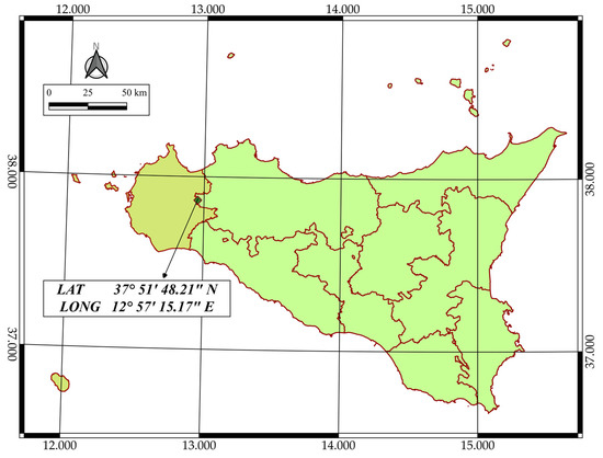 The study area is located in Calatafimi Segesta (Trapani, Italy); it has a surface of 5860 m2 and a perimeter of 344 m with flat orography (Figure 1). According to the Koppen–Geiger’s classification, the climate of the area is classified as Csa (Mediterranean hot summer climates; [41]). Climatic data of the year show a mean annual air temperature ranging from 18 °C to 22 °C and a mean annual precipitation of 550 mm (Sicilian Agrometeorological Information Service). The soil moisture regime is xeric, border with the aridic one, and the temperature regime is thermic.