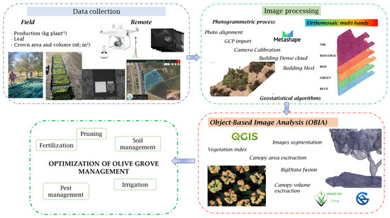 Since 1990’s precision agriculture (PA) gave the farmer the possibility of changing crop management. Indeed, PA is a strategy of management which takes into account variability with the goal of increase crop efficiency and production quality and quantity. Variability can be expressed in several ways. As reported by Zhang et al., (2002) [3], variability affecting agricultural production can be classified into six groups: yield variability; field variability; soil variability; crop variability; variability related to abnormal factors; and management variability. Moreover, there are various sensors and platforms which can be used to investigate variability [4,5,6]. Senay et al., (1998) [5] distinguish three ways of measuring spatial variability in the field: continuously, discretely (e.g., point sampling of soil or plant properties), and remotely (e.g., through aerial photographs). Discrete sampling is generally characterized by a high precision of the investigated variable but cannot describe the complete variability and need precision geo-statistic techniques to spatialise the data [7,8,9]. Therefore, remote sensing represents the most important technique of acquisition data for olive growth in precision agriculture management [4,10]. This, can be performed using platforms at different distance from the object, which determines the area wideness [11,12]. Precisely, in the olive orchard the most important platform used is the Unmanned Aerial Vehicle (UAV, [4,6]) because it allows to determine huge areas in a low time of flight and can be equipped with different sensors [13,14].