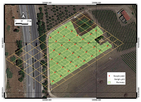 Field samplings were carried out in order to investigate nutritional status using a regular 15 m × 11 m grid on DOY 205 [22]. The sampling point was identified at the intersection point (node) of the sampling grid, excluding the most external part of the field (Figure 4). A total number of 36 points was sampled. The sample was represented by an experimental unit of four adjacent olive trees. Each leaf sample consisted of four sub-samples of 25 healthy, fully expanded and mature leaves, collected from the central portion of the current season’s unshaded branches at a height of 1.5 m above the ground surface, at the four cardinal points of each olive tree.