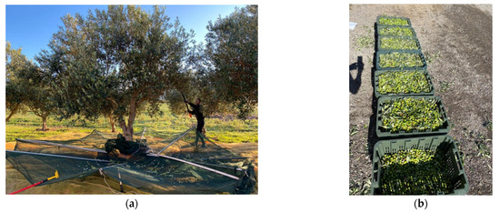 The olives were picked with a hand-held electric harvester model OLIVION P230 (Pellenc, SI, Italy; Figure 5), when their maturity index was equal to 2.38, determined according to Furferi et al., (2010) [44]. Two operators had the task of laying and wrapping the nets under each plant. Finally, the production of each plant and that of the whole plot were evaluated quantifying the harvested olives using a proper load cell [45].