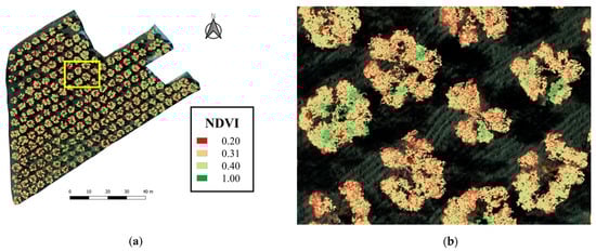 To express the vegetative variable, i.e., vigour, it was decided to use the TCSA, the canopy projection area and the canopy volume. Since the characteristics express a condition of vegetative vigour, all variables showed at least moderate correlations (Figure 8). TCSA is a condition formed over the years of cultivation and it cannot describe the annual condition of the plant, while the area of the canopy certainly expresses a precise condition at an exact moment. Probably, for this reason the canopy area was indeed more correlated with plant production and NDVI (Figure 10). The crop spectral conditions were investigated by calculating NDVI that describes the general vegetative and nutritional conditions of each plant because the bands used for its calculation (NIR and red) are strongly related with them [54,55]. In this study, the NDVI showed low values, especially where conditions of low vigour and low nitrogen concentration in the leaves were found. As also show in other studies [24,56] the NDVI has a good relation with the vegetative status (Figure 10). Moreover, when it correlates with the CA, it was able to discern the plants with high or low productivity with good precision (Figure 10a). When it was correlated with production, it was able to underline the plant with high vigour (precisely with high canopy area; (Figure 10b). NDVI showed better correlations with canopy area than the vigour parameters because the multispectral bands used in the calculation are sensitive to both effects: leaf efficiency (red band) and canopy structural conditions (NIR band) [54]. Since production was mainly linked to the availability of plant resources and therefore to CA, NDVI always proved to be a good indicator and predictor of production even in non-optimal nutritional conditions. These results emphasize that NDVI is more capable to determine the vegetative parameters than production. Therefore, by having precise multispectral and RGB images of the entire olive orchard, it is possible to use this information to obtain crop status data that can be used in development models or DSS for the optimization of agronomic management.