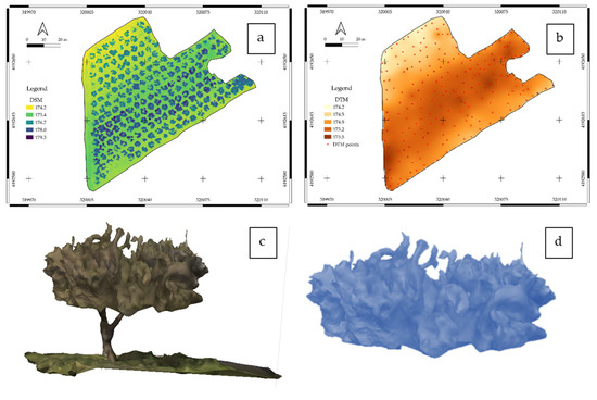 The DSM was extracted directly from the photogrammetric processing while the DTM was derived from some terrain point random selected and spatialized using a geostatistical method (Figure 7). After calculating DTM and DSM, it was possible to determine the CV using the following Equation (2) as defined in [24]: