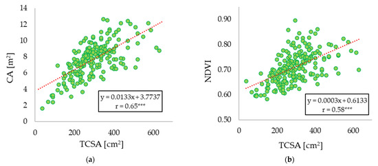 (a) Correlations between TCSA and CA; (b) correlations between TCSA and NDVI calculated as the average of all pixels within the CA of each tree. p value < 0.001 (***).