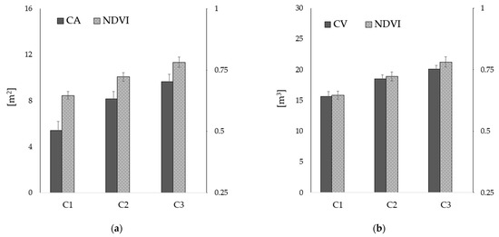 (a) CA and NDVI values (±st. dev) for the three clusters; (b) CV and NDVI values (±st. dev) for the three clusters.