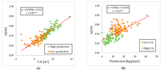 (a) Correlation value between NDVI and Canopy area (m2); (b) NDVI and Production kg/plant).