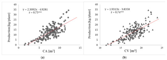 (a) Correlation between CA and Production; (b) correlation between CV and Production.
