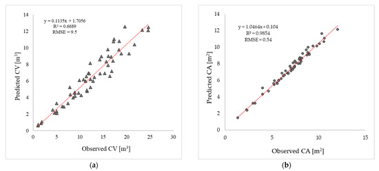 (a) Comparison between ground measured and UAV-estimated CV; (b) comparison between ground measured and UAV-estimated CA.
