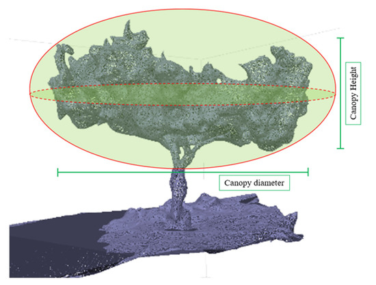 where Cl is the Canopy length (m); Cw is the Canopy width (m); Th is the tree canopy height (m). The effectiveness of the entire procedure to measure volume and area of the canopy of the fifty selected trees was evaluated by calculating the root mean square error (RMSE) and correlation coefficient derived from the regression fit.